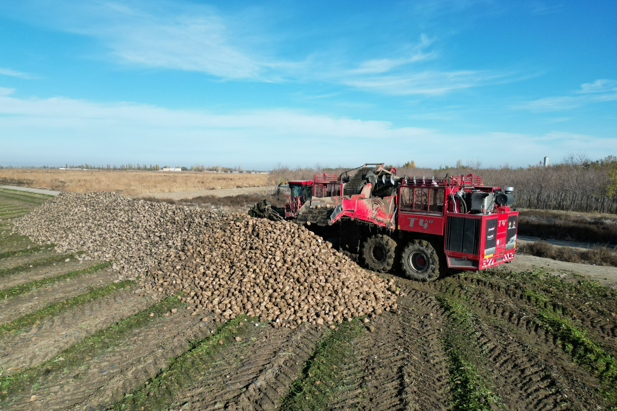 11月1日,在庆阳湖乡二工梁村张庆栽培的甜菜地,放眼望去,成片的甜菜生气勃勃,跟着甜菜采挖机地来回络绎,一颗颗夹杂着泥土的甜菜在多重过滤设备下被层层剥离出来,顺着传输带滚落到贮存筐内,散发着丰盈的气味。